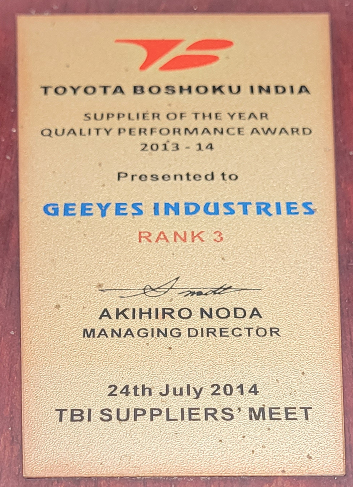 We have received the Best supplier award in 2019 from M/s Rane TRW for the category of NEW PRODUCT DEVELOPMENT.